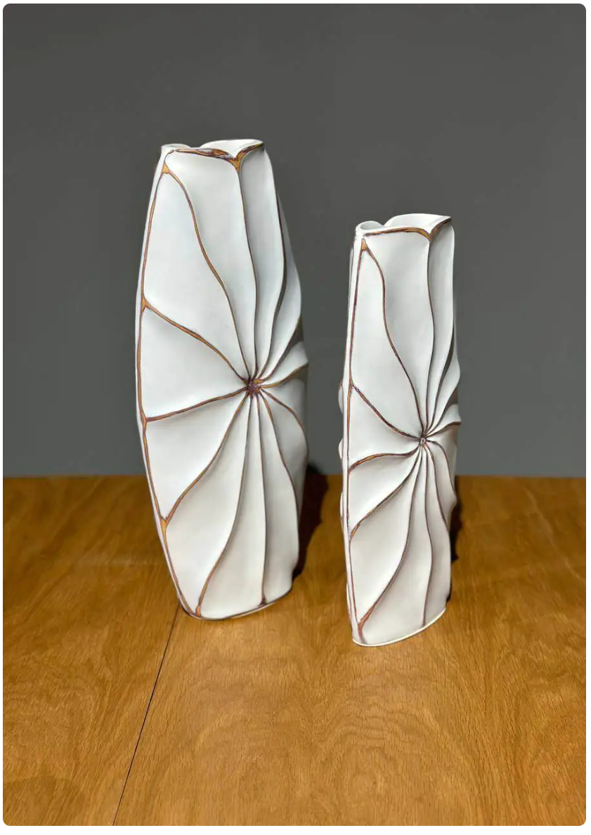Высота большой вазы: 50 см Ширина большой вазы: 22 см Высота маленькой вазы: 44 см Ширина маленькой вазы: 17 см