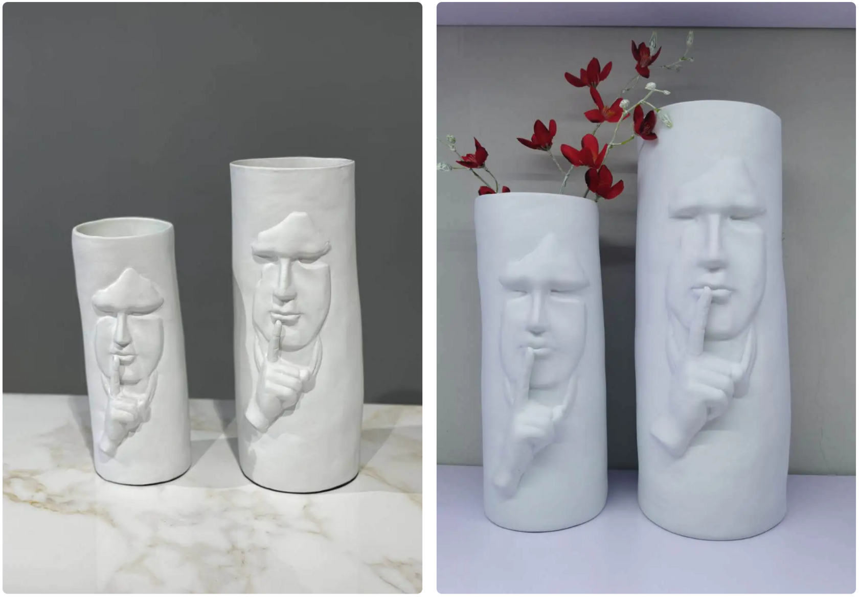 Высота большой вазы: 40 см Ширина большой вазы: 17 см Высота маленькой вазы: 32 см Ширина маленькой вазы: 15 см