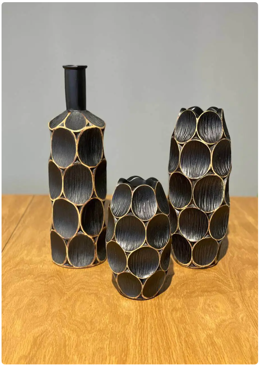 Высота вазы-бутылки: 41 см Диаметр вазы-бутылки: 12 см Высота средней вазы: 33 см Диаметр средней вазы: 9 см Высота маленькой вазы: 22 см Диаметр маленькой вазы: 7 см
