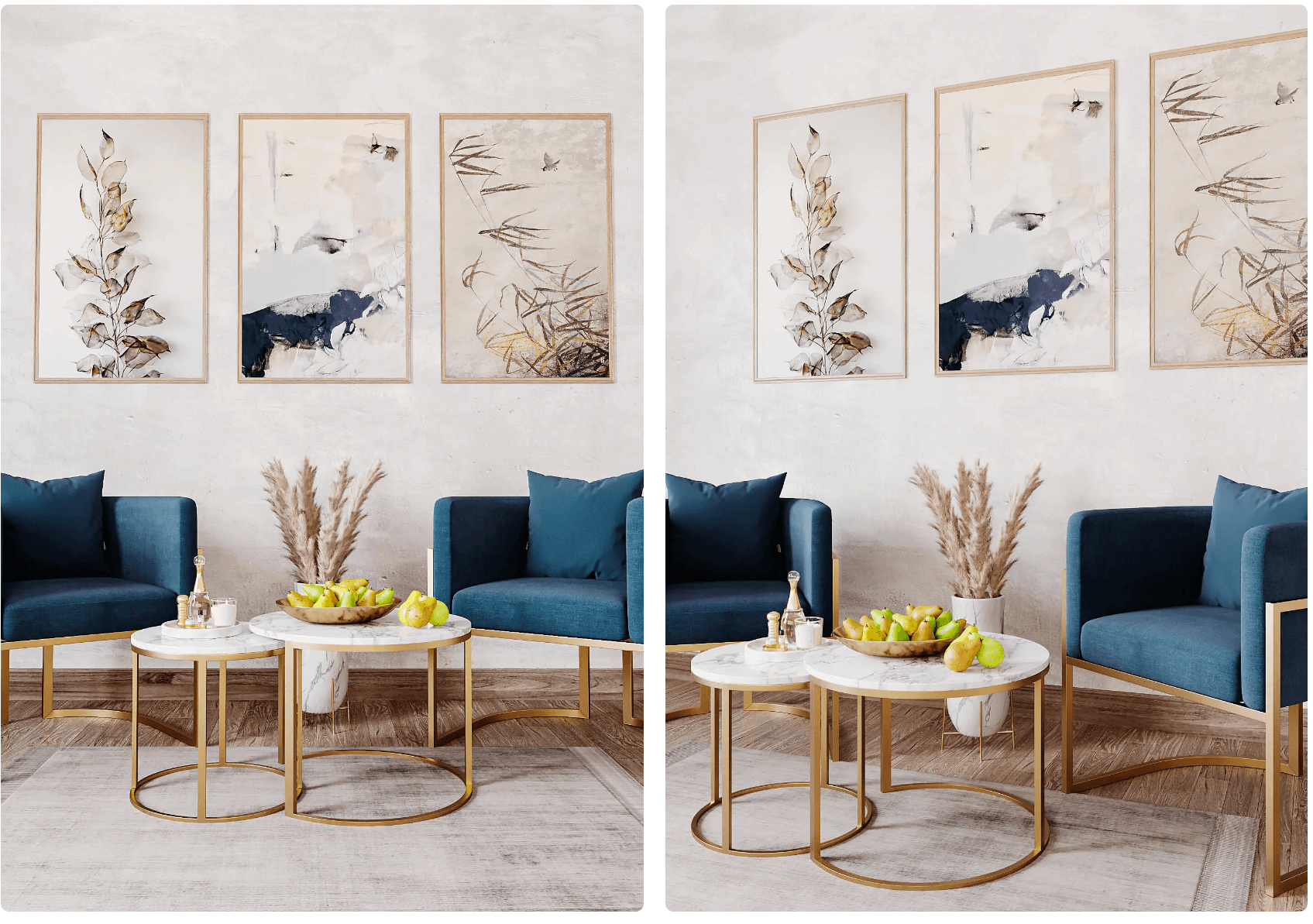 Толщина столешницы, см: 2.6 см Диаметр, см: большой стол — 75 см, маленький стол — 50 см Высота, см: большой стол — 50 см, маленький стол — 42см